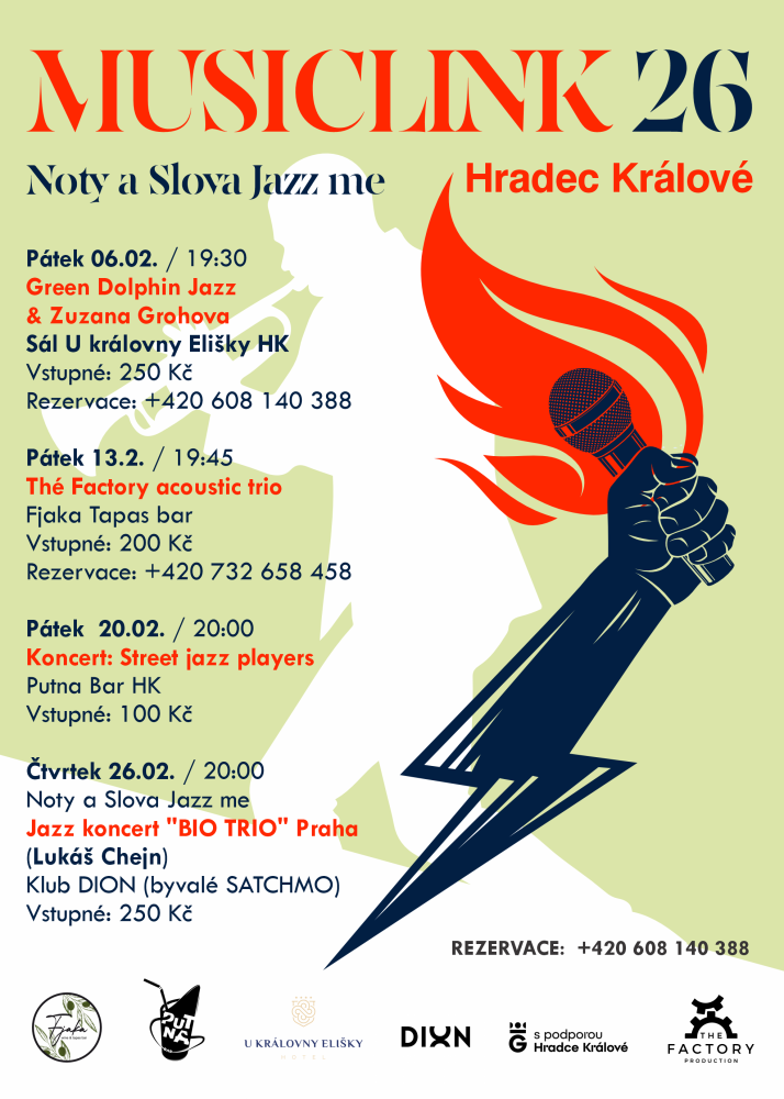 Projekt MUSICLINK 2026 je roční projekt série koncertů ve třech programových liniích, NOTY a SLOVA Jazz me (Alternativní jazz hudba), DJs FUSION ATTACK (Hip Hop, House a elektronická hudba DJs + Performers), EUROTUNES (World music). Program se bude pravidelně realizovat ve klubu DION, Putna Bar, Fjaka Tapas Bar a v sále vinárny Hotelu U Královny Elišky HK.