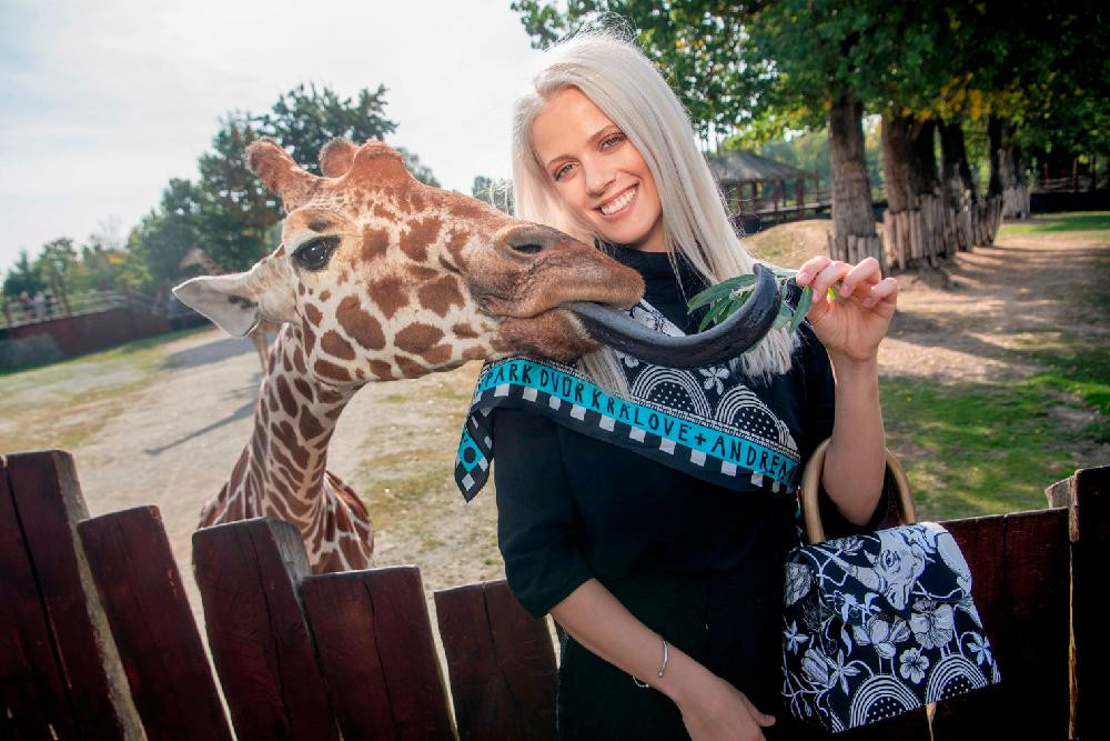 Modelka Terezie Kovalová a žirafa Lukrécie s šátkem a kabelkou