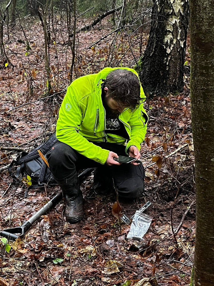 Matouš Holas při práci s detektorem a při evidenci nálezů v terénu
