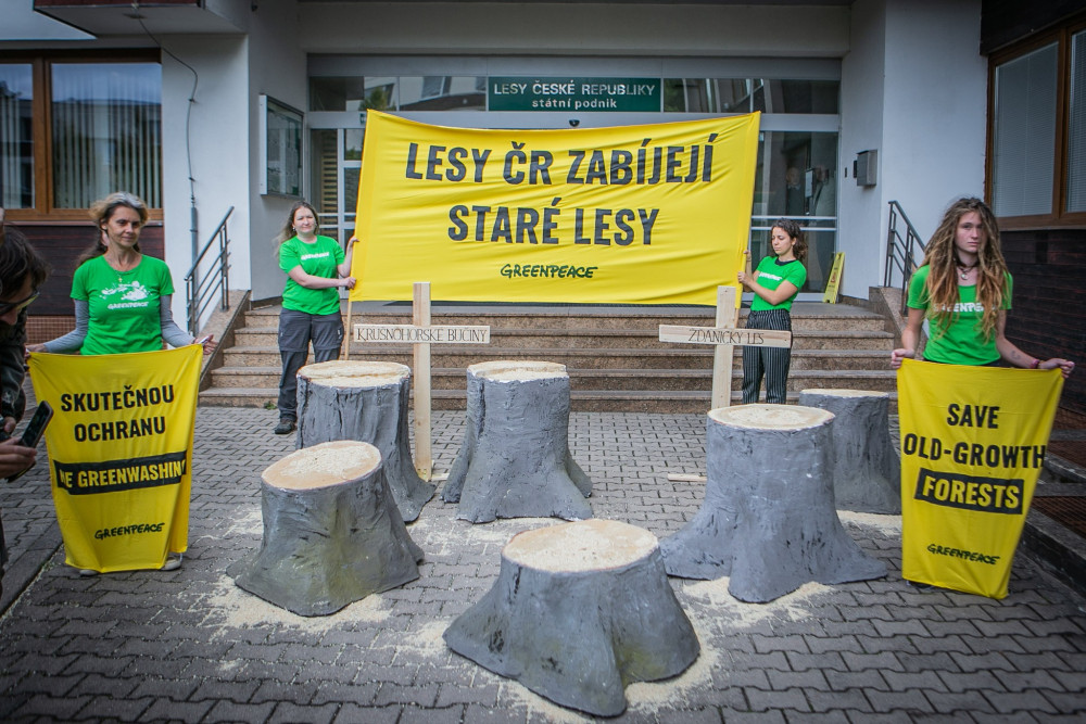 Zástupci Greenpeace před sídlem Lesů ČR protestovali proti kácení starých lesů
