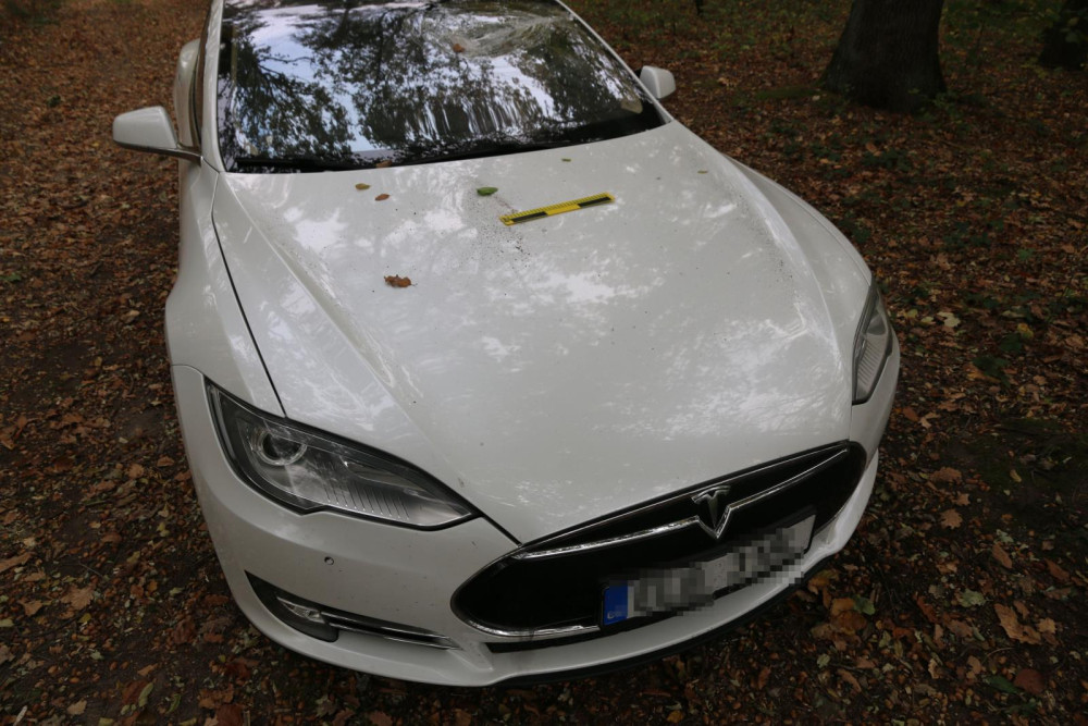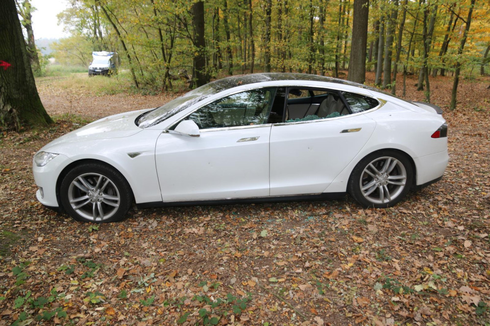 FOTO: Náhodný vandalismus nebo cílený útok? Poškozená Tesla na lesní cestě