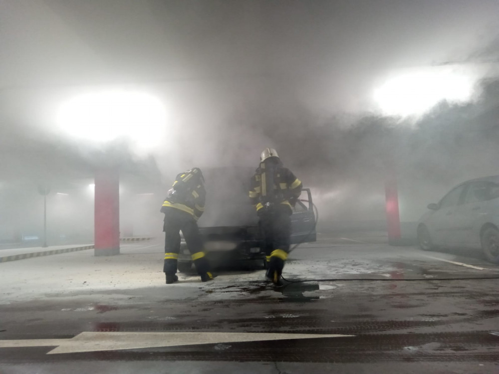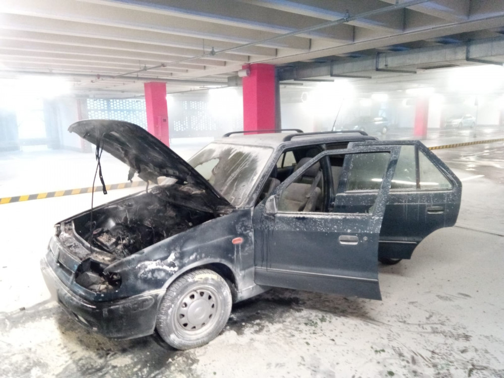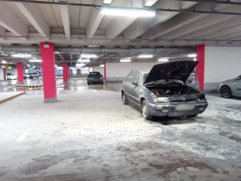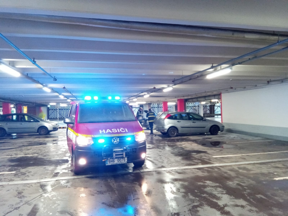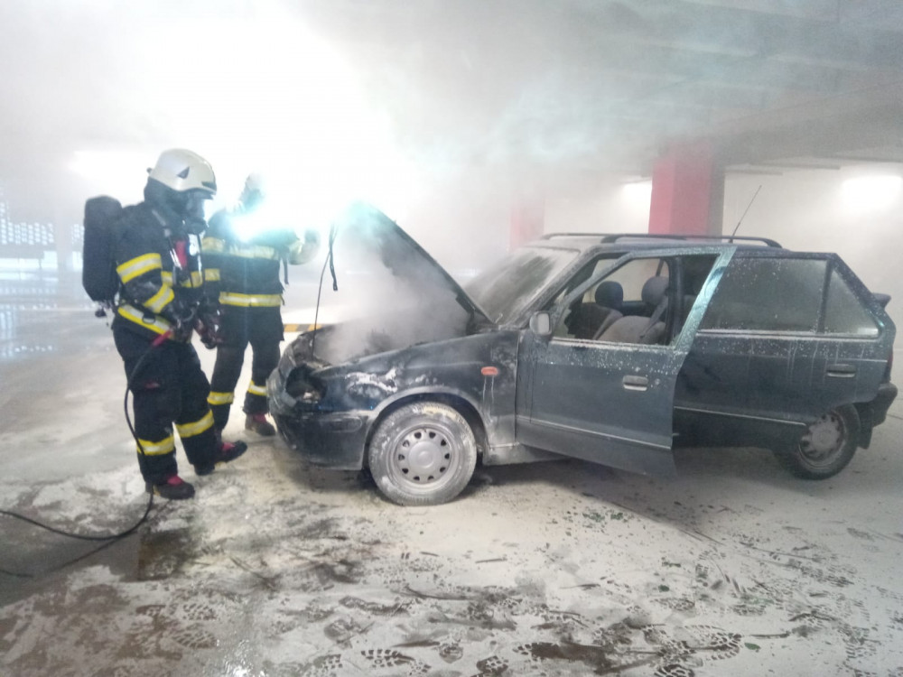 FOTO: V garážích obchodního centra Futurum hořel osobák, během několika minut byl požár uhašen