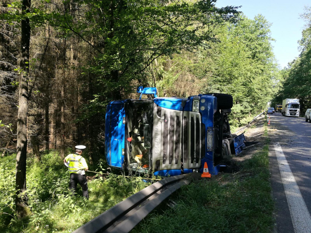 FOTO: Řidič usnul a na rovince převrátil kamion. Po nehodě nadýchal 2,3 promile