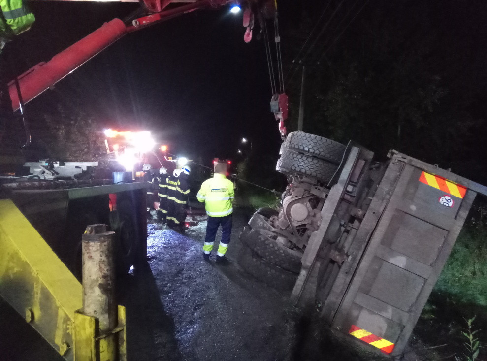 Převrácený nákladní automobil.