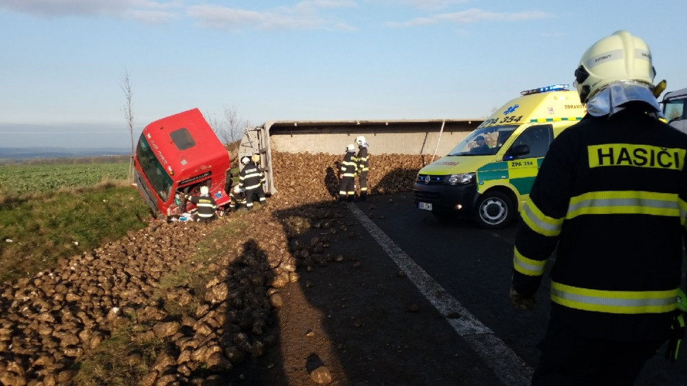 FOTO: Převrácený kamion, který převážel řepu, zablokoval celou silnici