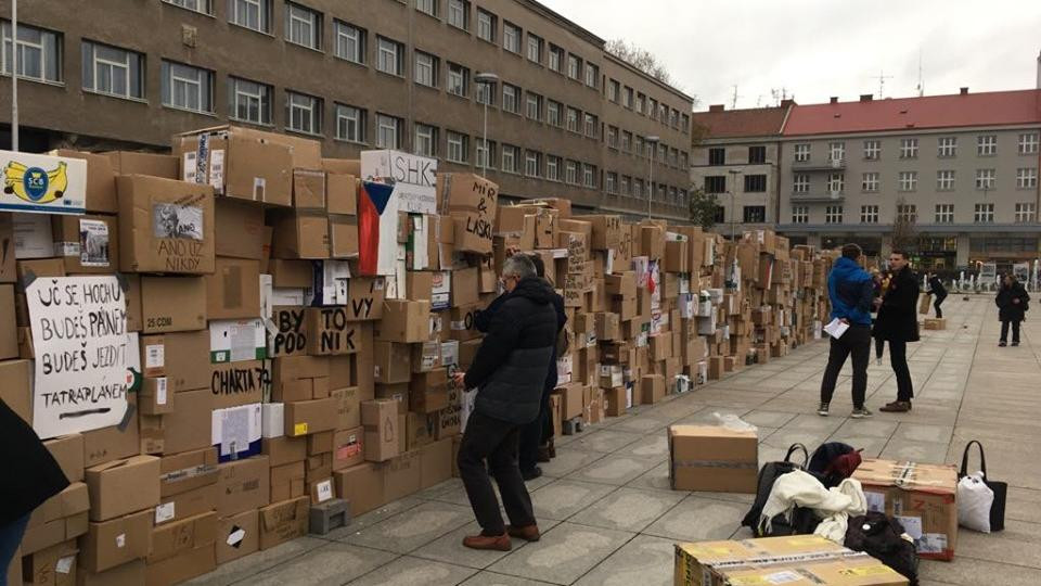 Zeď z krabic k výročí sametové revoluce na Ulrichově náměstí se hroutí