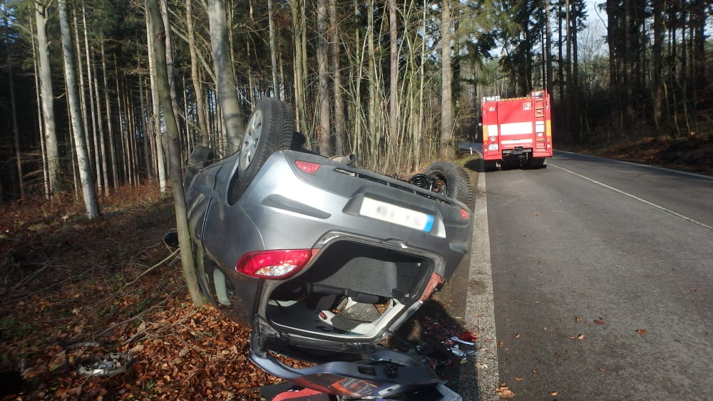Automobil skončil zdemolovaný na střeše, nehoda si vyžádala jednu zraněnou osobu