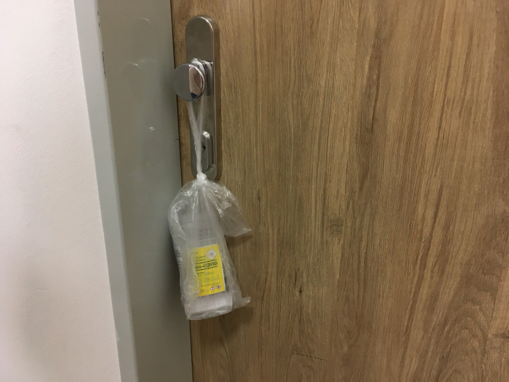 Dezinfekce na klice jednoho z bytů ve Stěžerech u Hradce Králové.