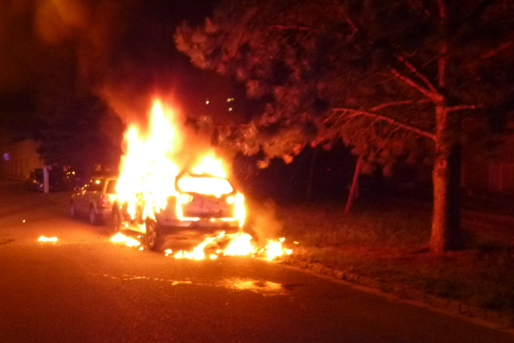Hořící auto ve Škroupově ulici v Hradci Králové