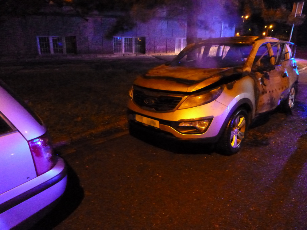 Hořící auto ve Škroupově ulici v Hradci Králové
