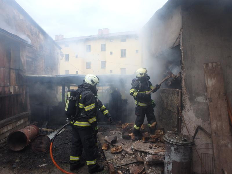 Hasiči při likvidaci požáru kůlen v Úpici.