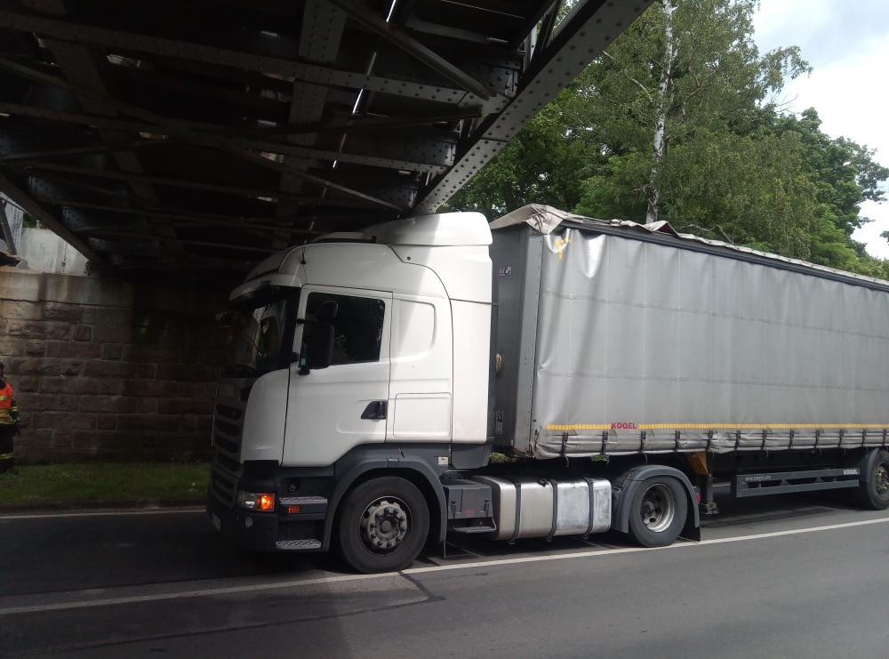 Zaklíněný kamion pod viaduktem v Trutnově