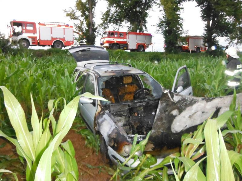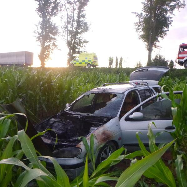 Hasiči museli do kukuřičného pole u Lázní Bělohrad, po nehodě se tu vznítilo auto