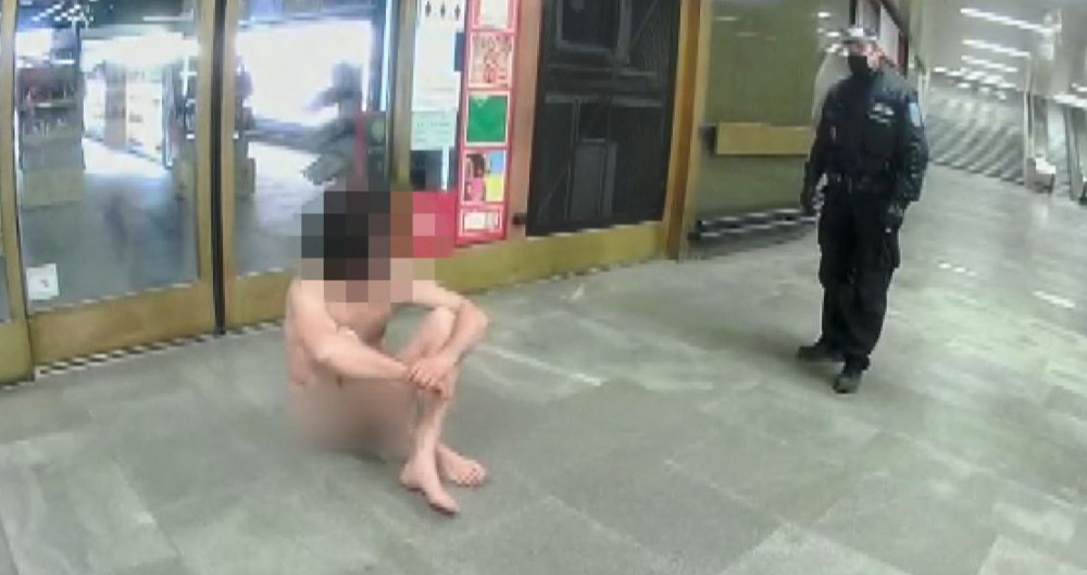 Sundej si vestu a pojď si to se mnou rozdat, křičel nahatý bezdomovec na strážníky v obchodě