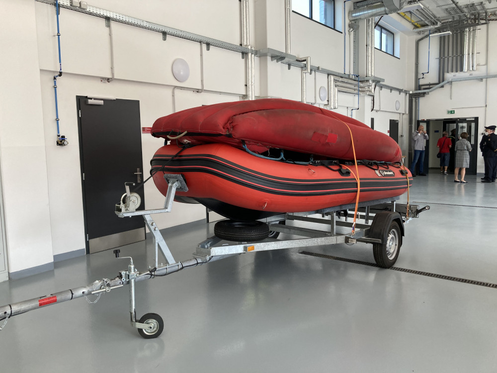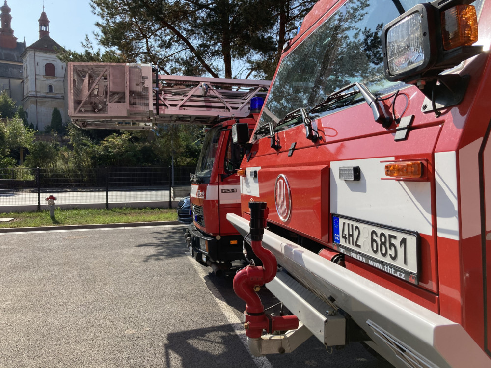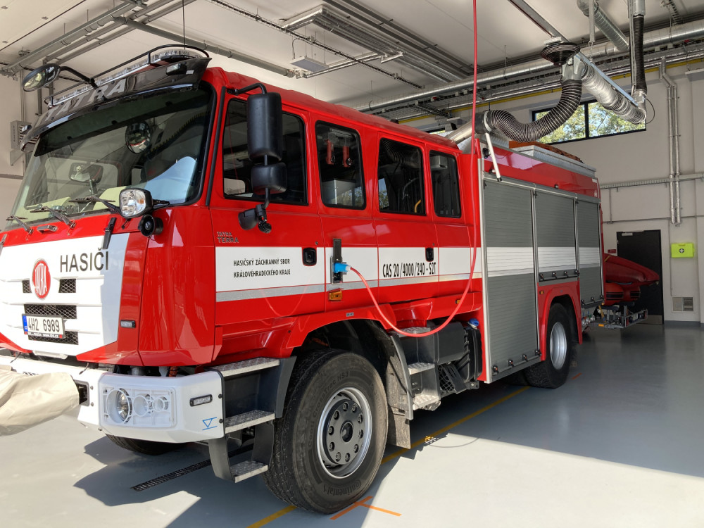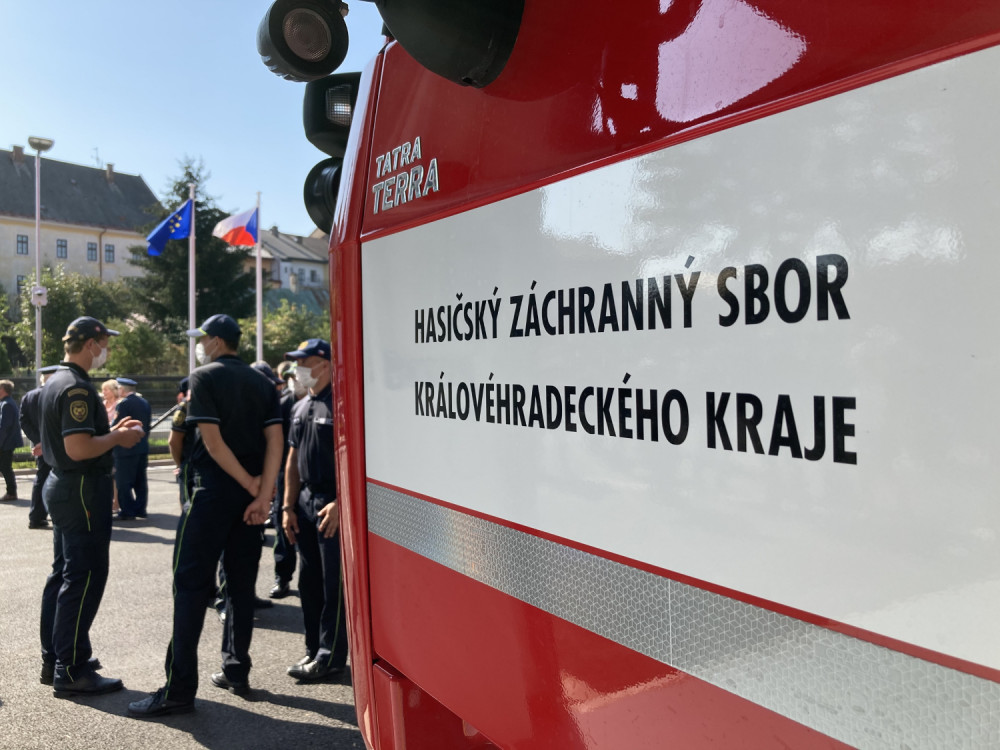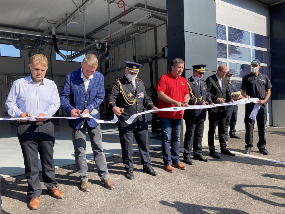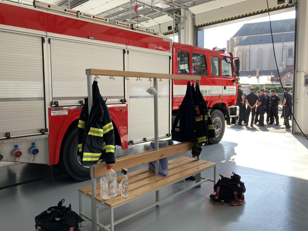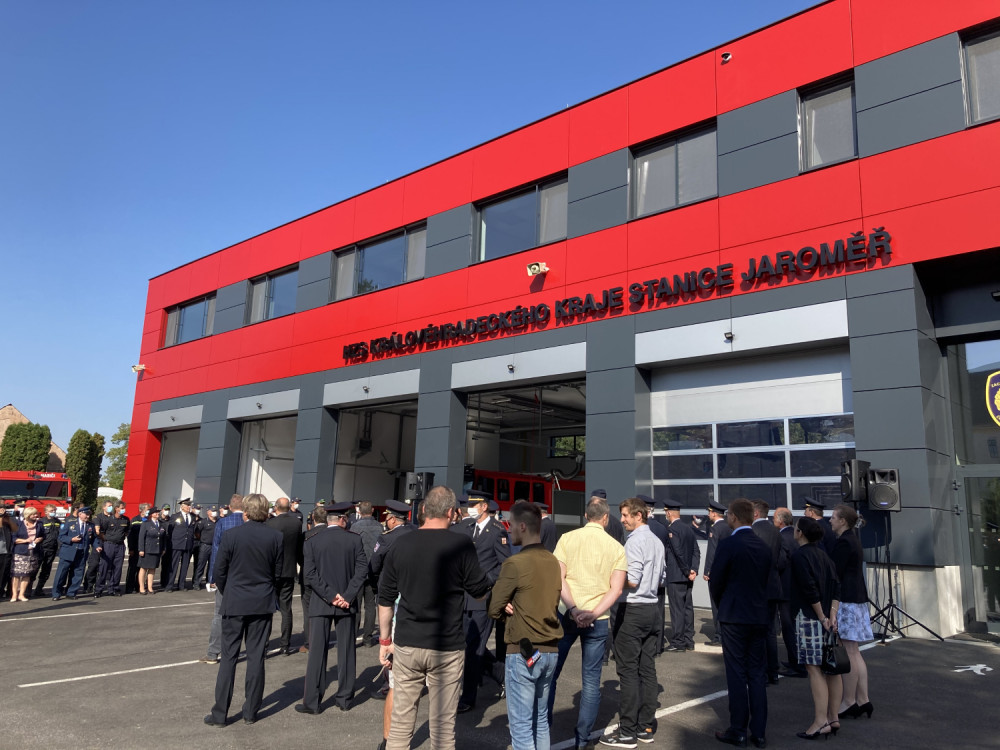 V červeném tričku dnes Hamáček otevřel hasičskou zbrojnici v Jaroměři. Doteď hasiči vyjížděli z plechových buněk