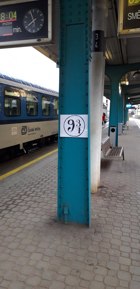 Z vlakového nádraží v Hradci Králové rovnou do Bradavic. Vtipálek zde označil nástupiště 9 a 3/4
