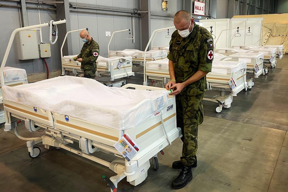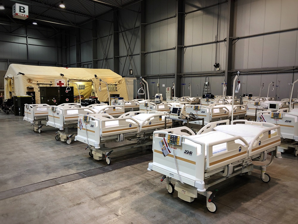 FOTO | VIDEO: Záložní nemocnice v Letňanech je hotova. Materiál na ni byl dovezen z Hradce Králové
