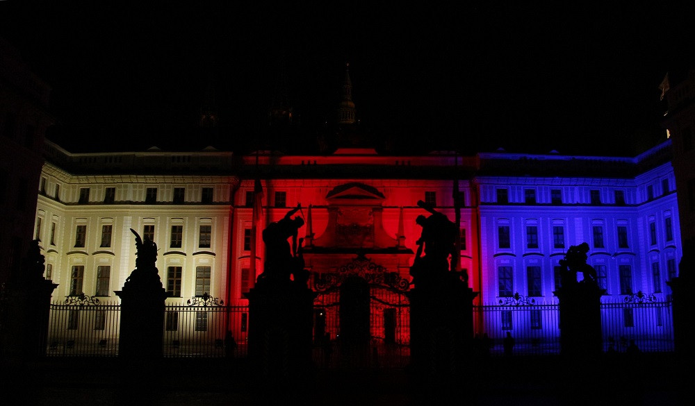 Slavnostní osvětlení v barvách české trikolóry ozdobilo pro dnešní večer I. nádvoří Pražského hradu