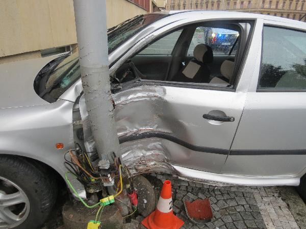 Nehoda v centru Hradce. Řidič najel na chodník a do sloupu veřejného osvětlení