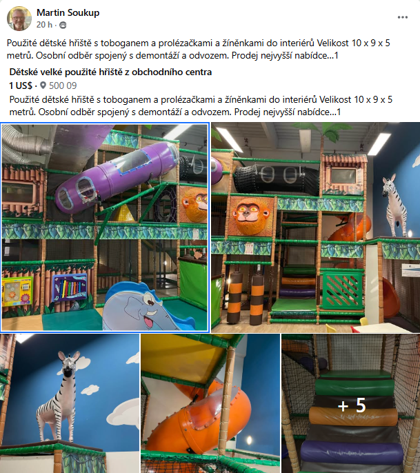 Lidi v Hradci Králové pobavil a zaskočil inzerát, který se v těchto dnech objevil na jedné facebookové skupině, která se zabývá bazarovým prodejem. Ke koupi se tam objevilo kompletní dětské hřiště i s tobogánem z dětského koutku v obchodním centru Orlice park v Hradci Králové. Kompletní vybavení si odveze ten, kdo dá nejvíc.