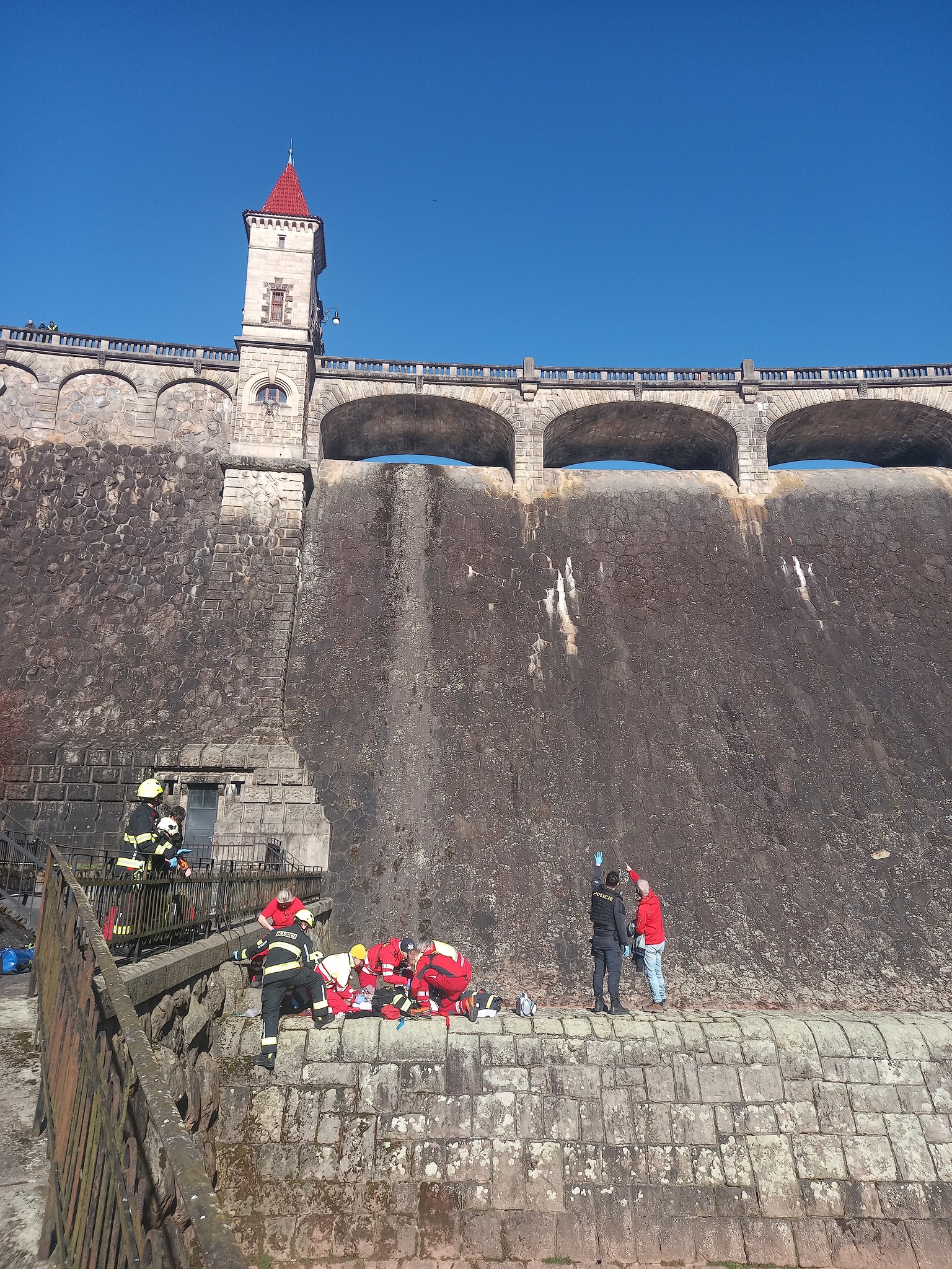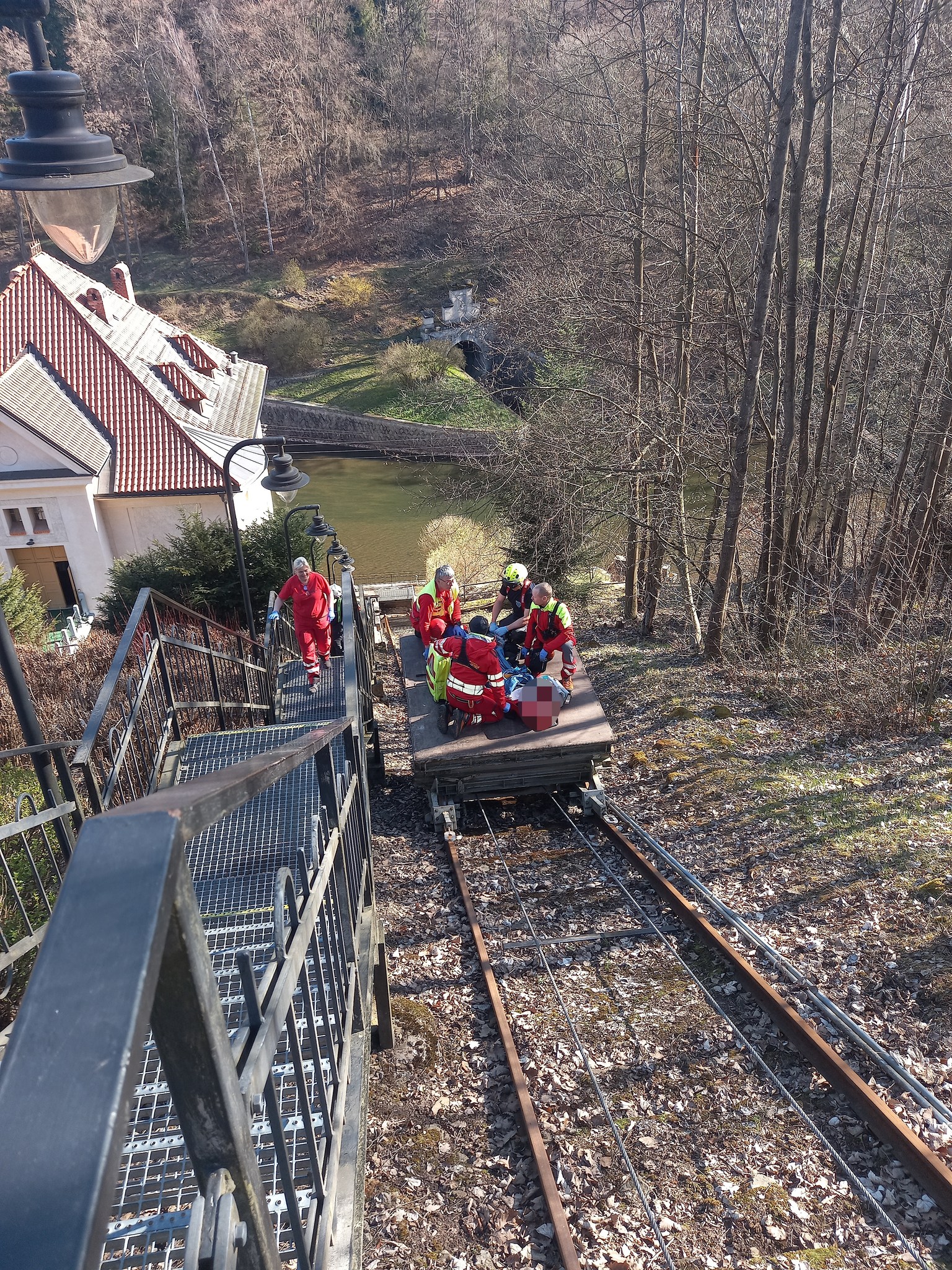 Po prvotním ošetření následoval náročný transport. Záchranáři využili výtahový systém na hrázi, pomocí kterého zraněného dostali zpět do bezpečného prostoru.