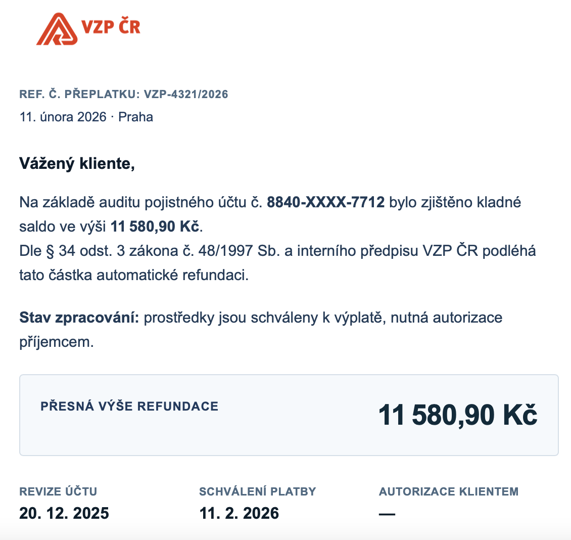 Vypadá to velmi věrohodně a lákavě. Pojišťovna VZP informuje, že máte přeplatek na pojistném 11 580,90 korun. Peníze jsou připravené k výplatě, je pouze nutná autorizace příjemcem. Tu je nutné provézt do 14 dnů, jinak nárok údajně zanikne. Jenže je to celé podvod, který na internetu zdaleka není novinkou. Právě časový tlak a přesná částka mají vzbudit důvěru.